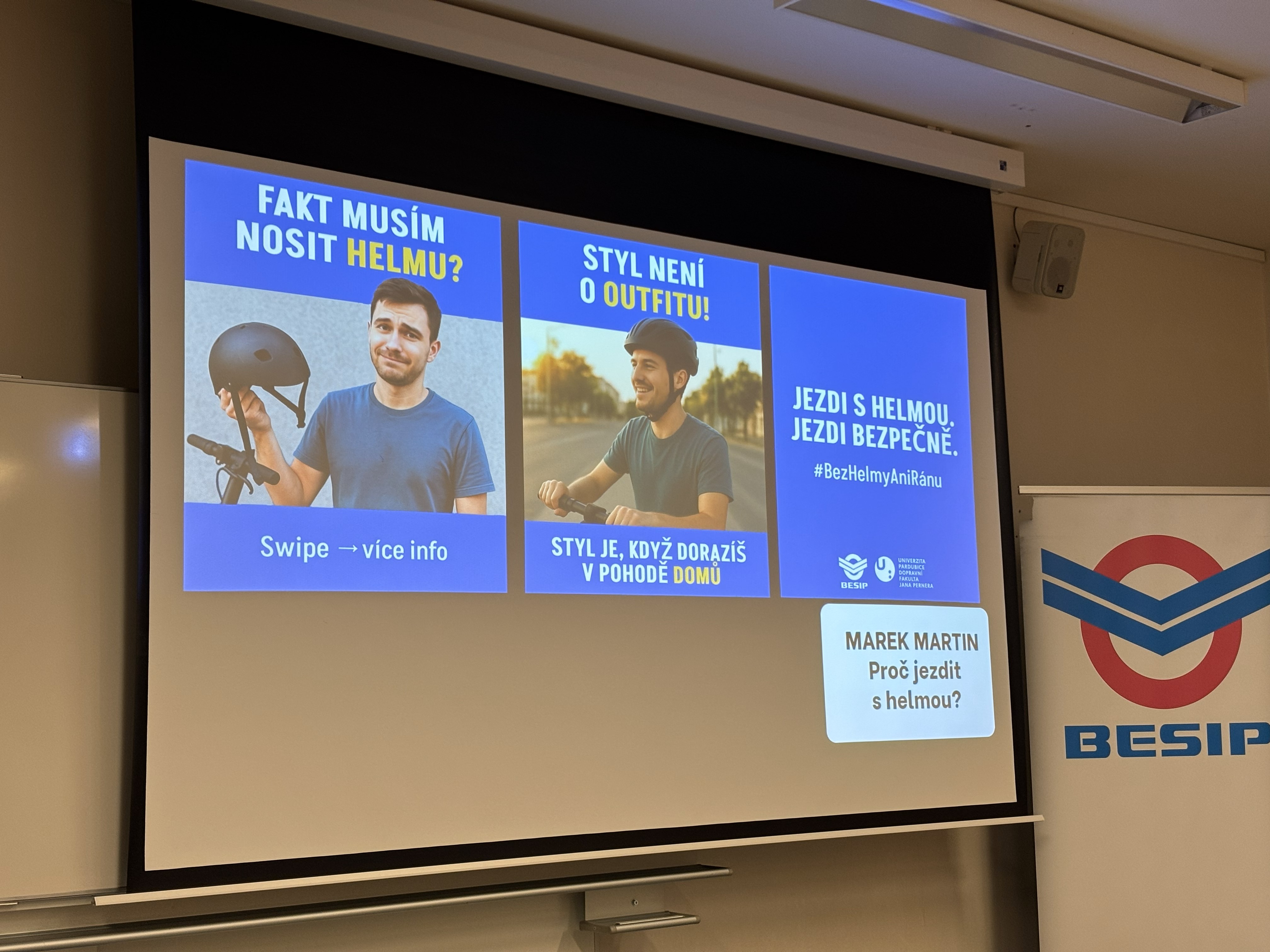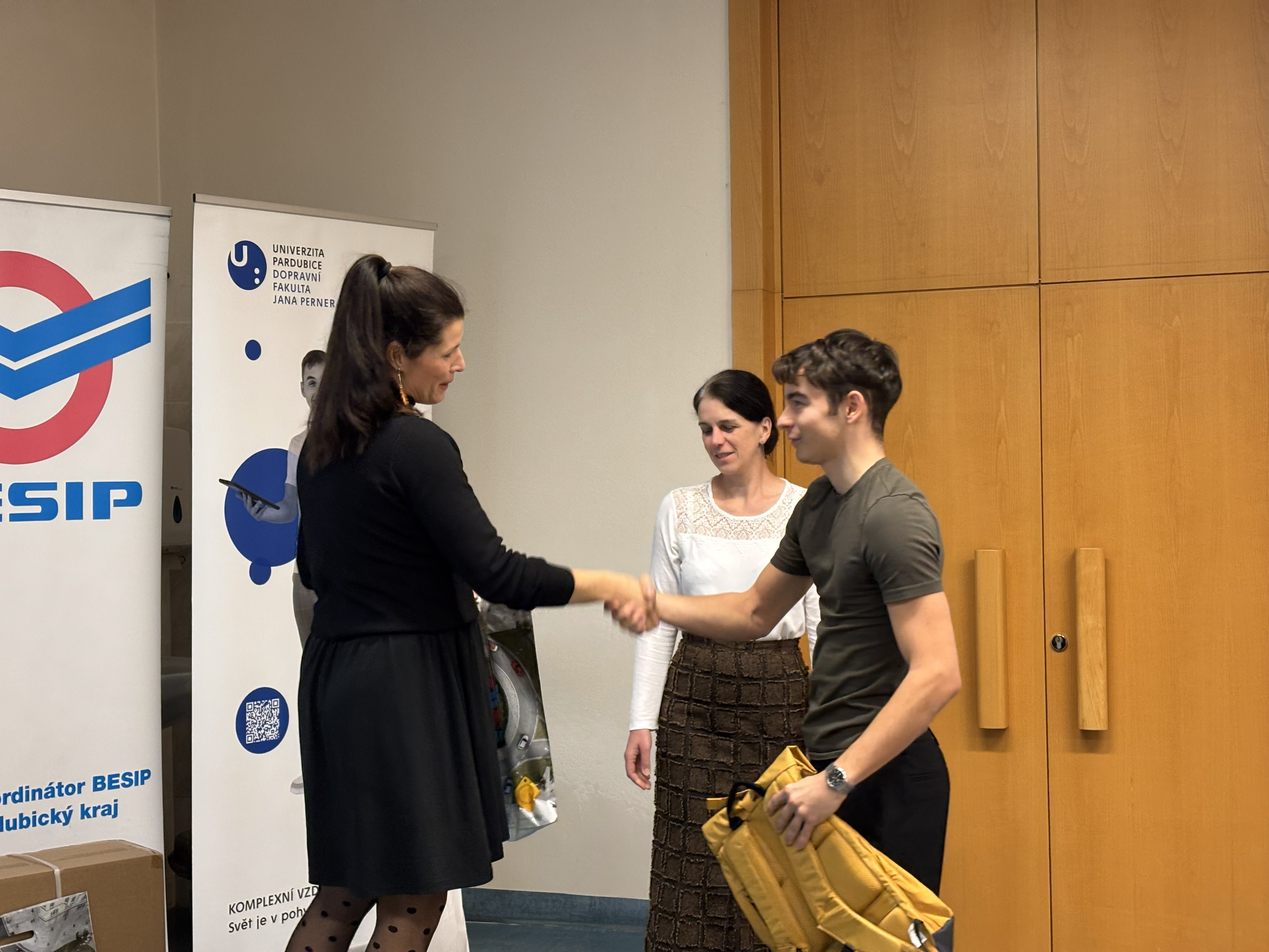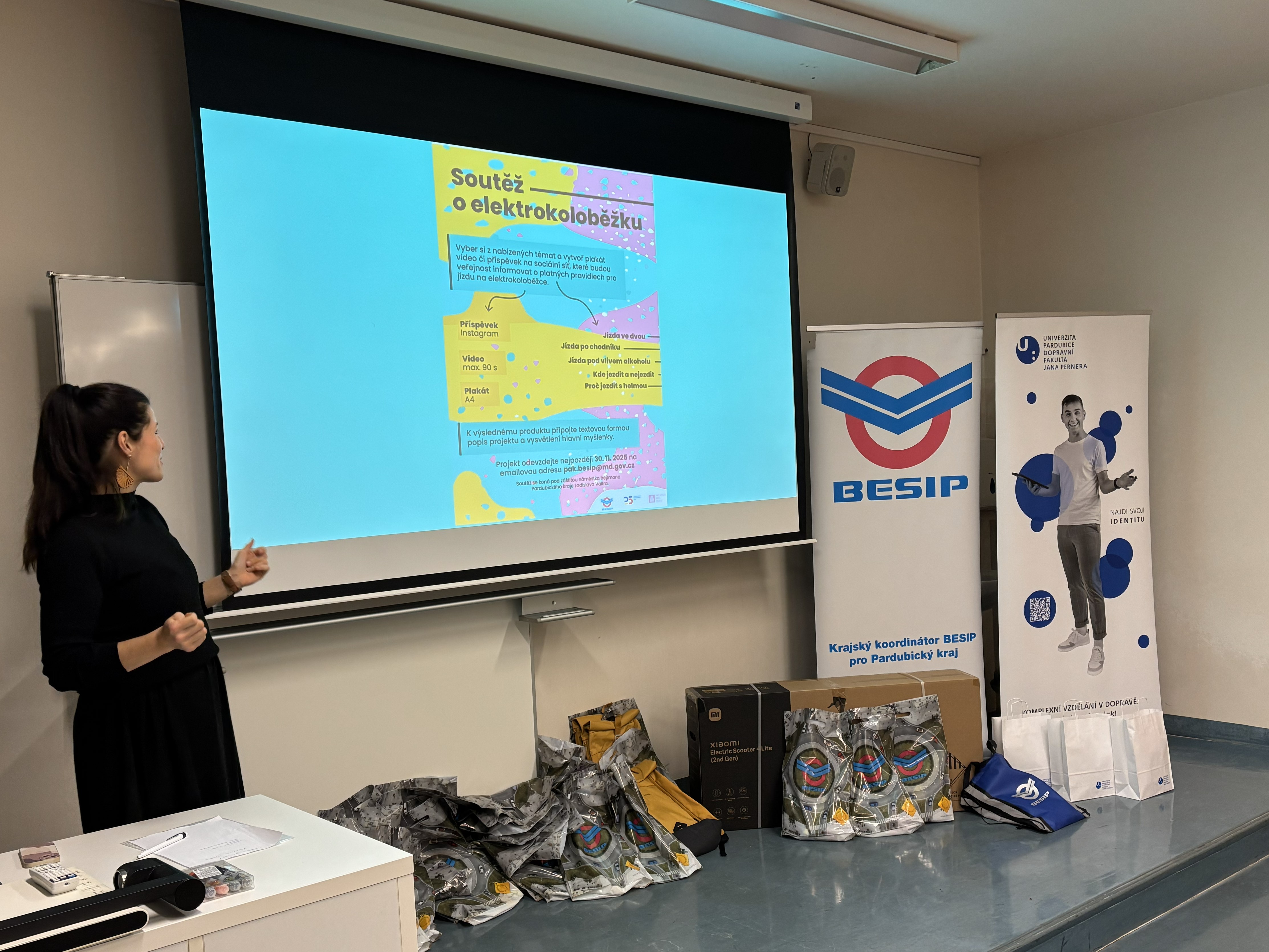 Ve čtvrtek 18. prosince 2025 proběhlo slavnostní vyhlášení vítězů soutěže o elektrokoloběžku, kterou každoročně pořádá BESIP ve spolupráci s Dopravní fakultou Jana Pernera Univerzity Pardubice. Projekt probíhal od září do konce listopadu a zapojilo se do něj 46 studentů naší univerzity, kteří připravili originální návrhy na téma bezpečná jízda na elektrokoloběžce.