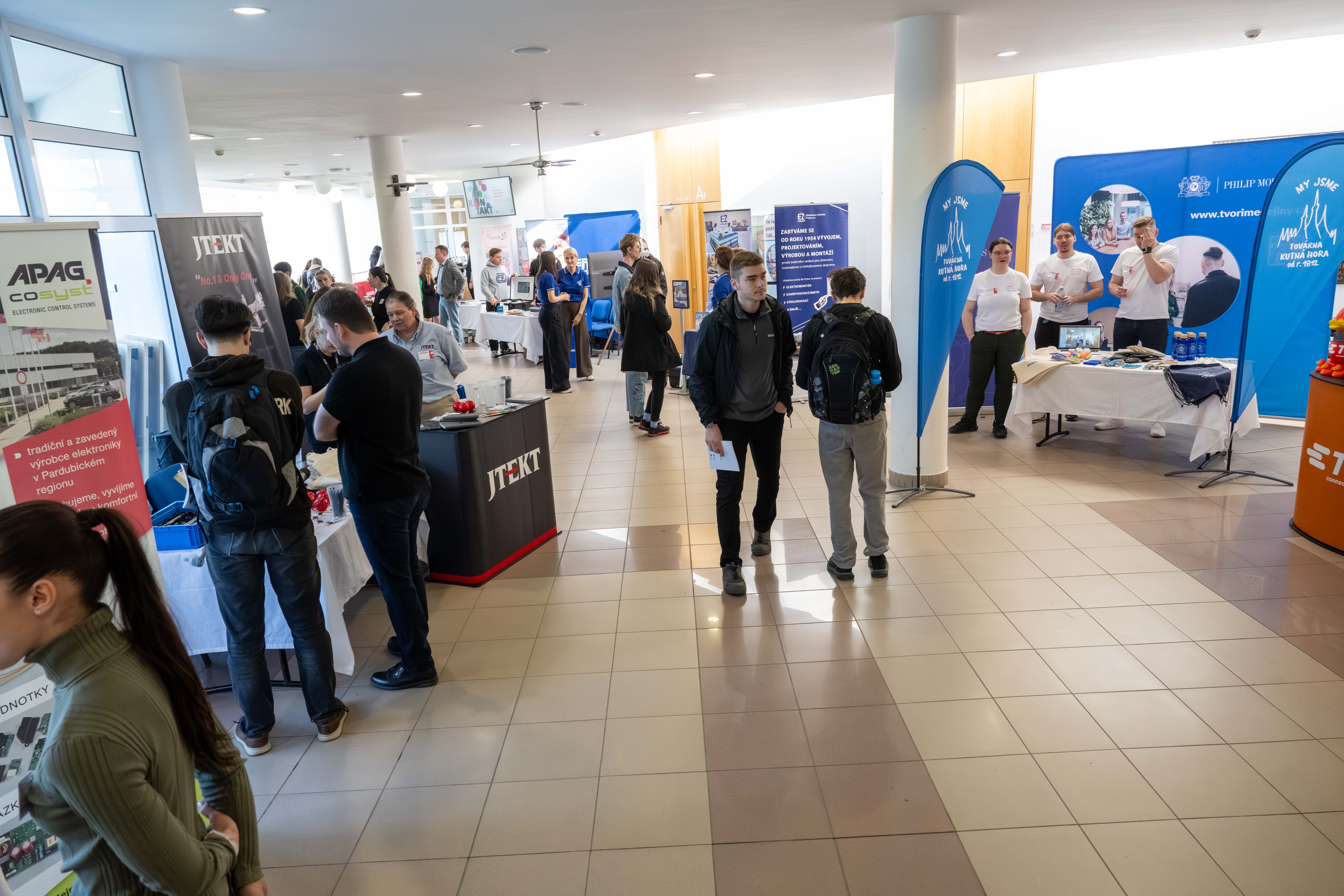 Na Univerzitě Pardubice proběhl minulý týden další ročník tradičního veletrhu KONTAKT, jehož cílem je propojit studenty s potenciálními zaměstnavateli. V areálu kampusu se představilo téměř osmdesát firem a institucí nabízejících široké spektrum pracovních příležitostí – od stáží a brigád až po trainee programy a pozice určené absolventům. Dopravní fakulta Jana Pernera letos poprvé nabídla své otevřené prostory vybraným vystavovatelům, kteří reprezentovali především oblast dopravy, logistiky, techniky a další příbuzné obory. Tímto krokem fakulta rozšířila podporu celouniverzitnímu týmu a zároveň posílila vlastní snahu o hlubší propojení výuky s praxí a o vytváření prostředí, kde se studenti mohou setkávat s odborníky z reálného pracovního prostředí.